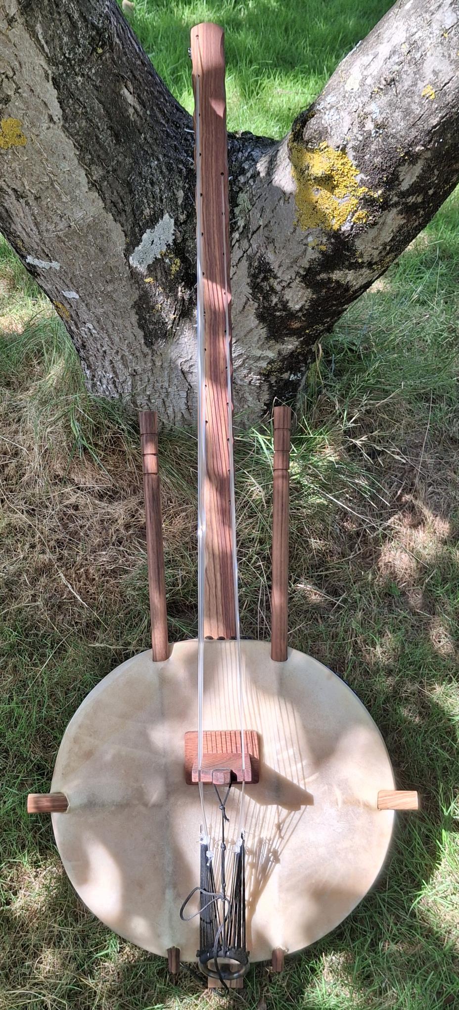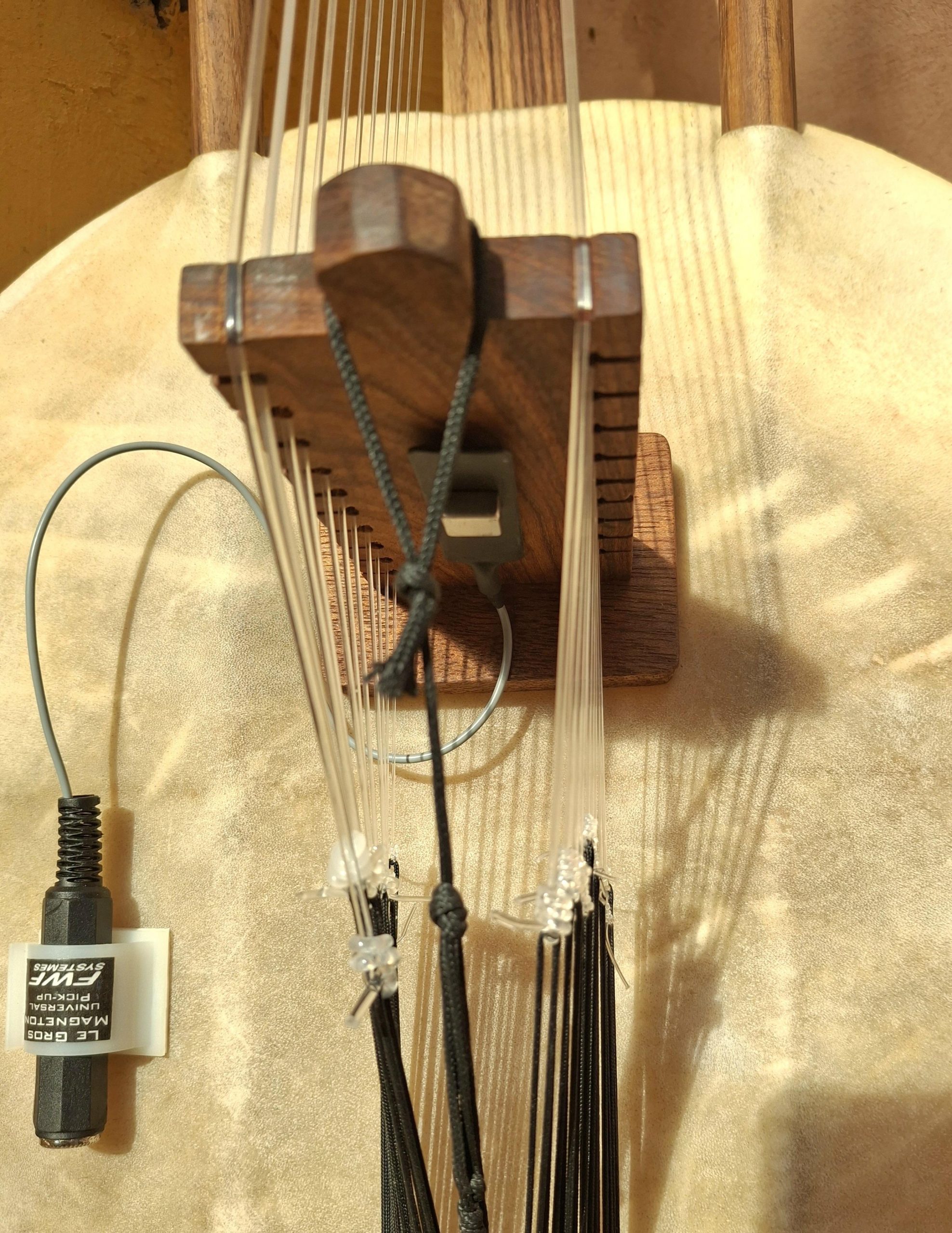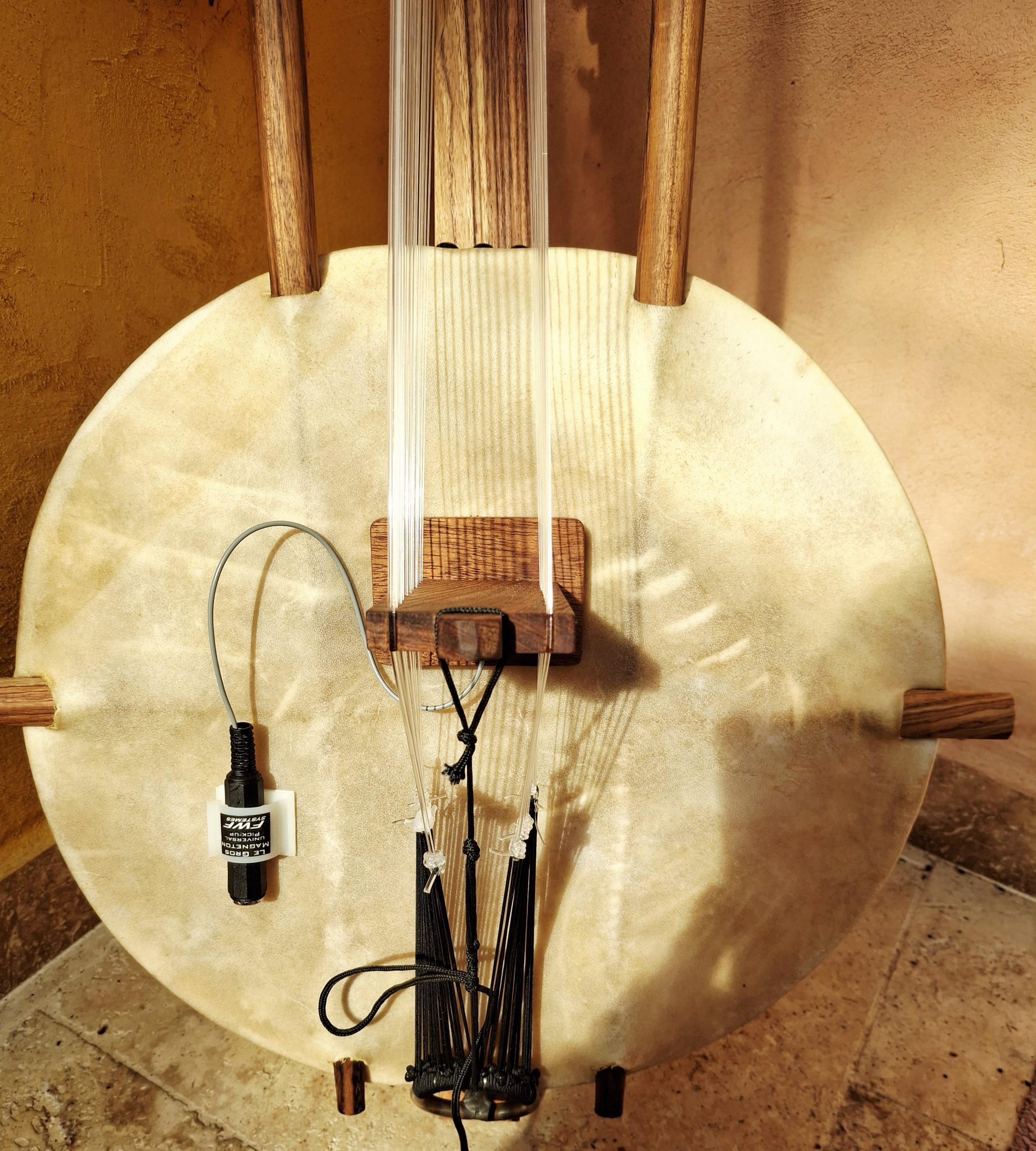 Kora pro avec une calebasse taille medium, sonorisée avec un micro type Gros Magnéton, permettant les changements de tonalité.