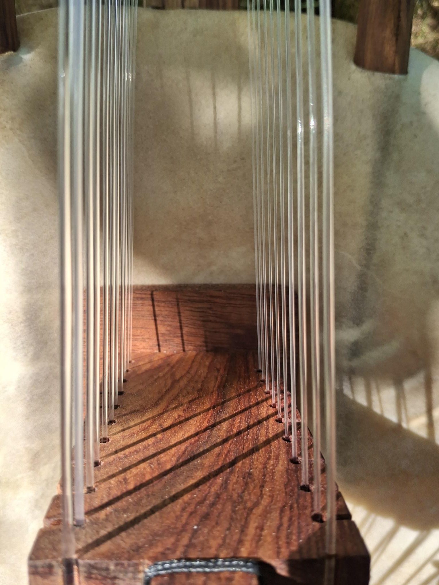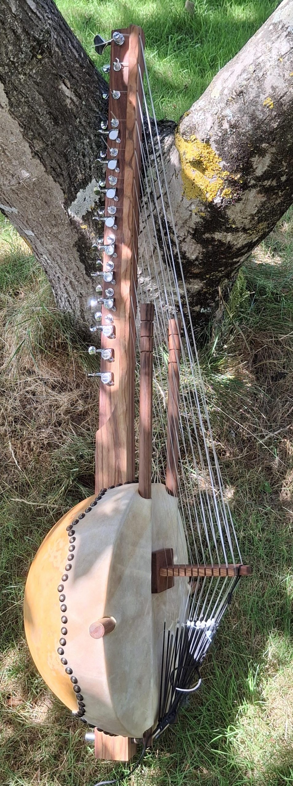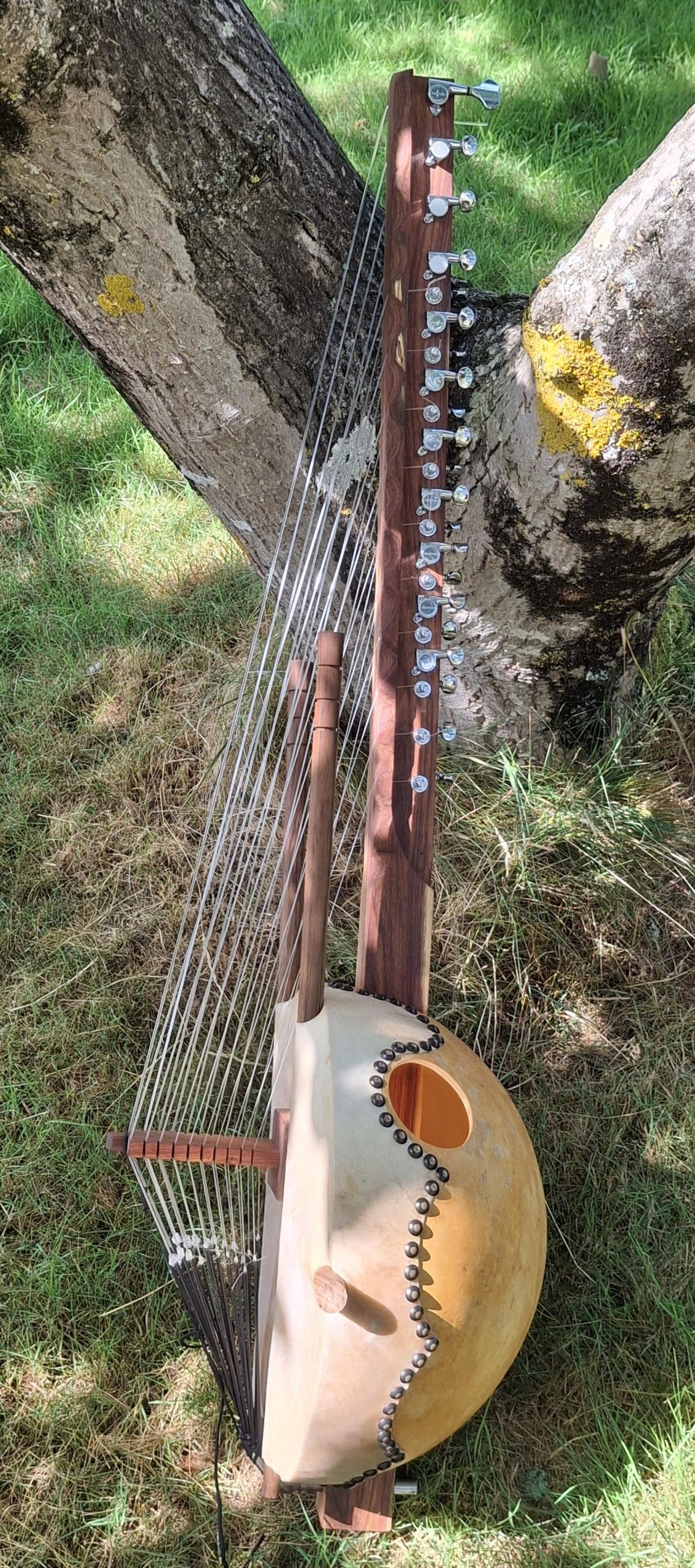 Kora pro avec une calebasse taille medium, sonorisée avec un micro type Gros Magnéton, permettant les changements de tonalité.