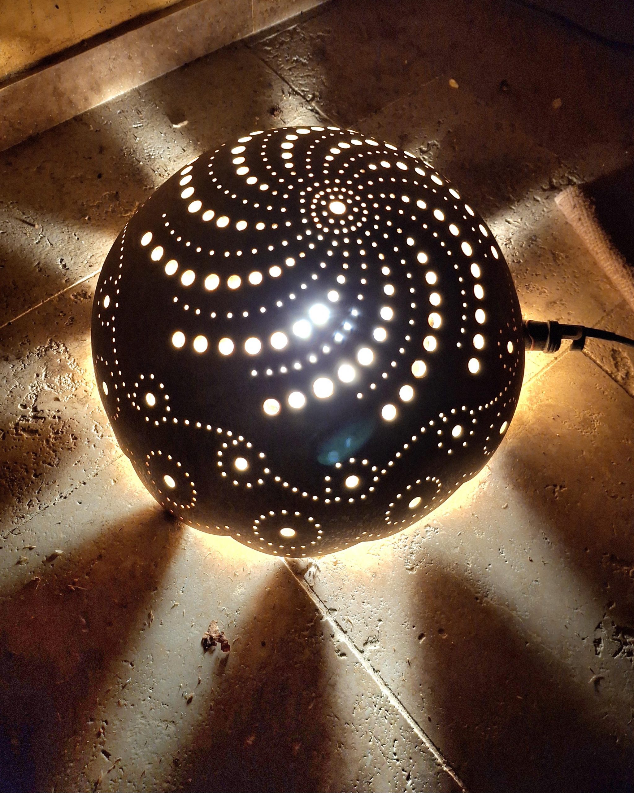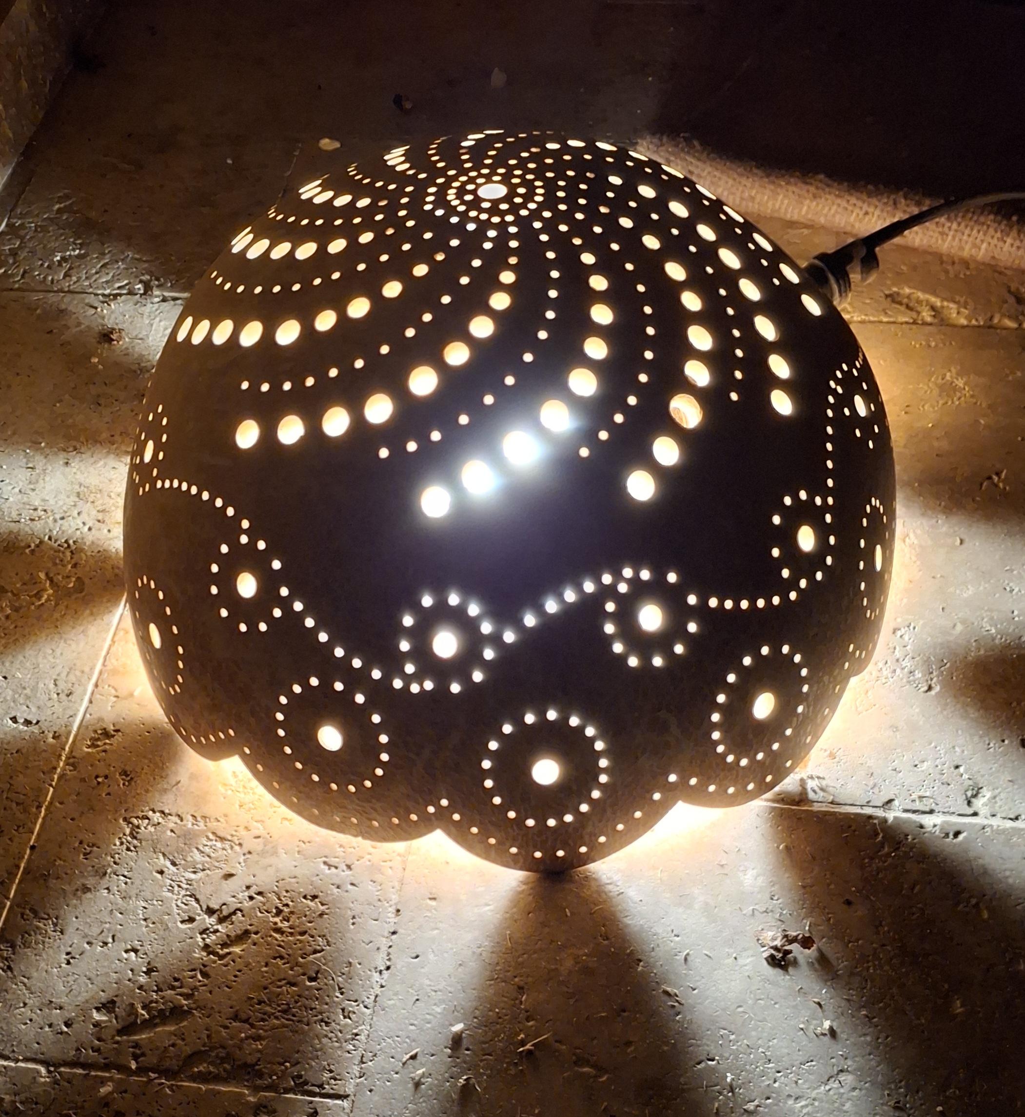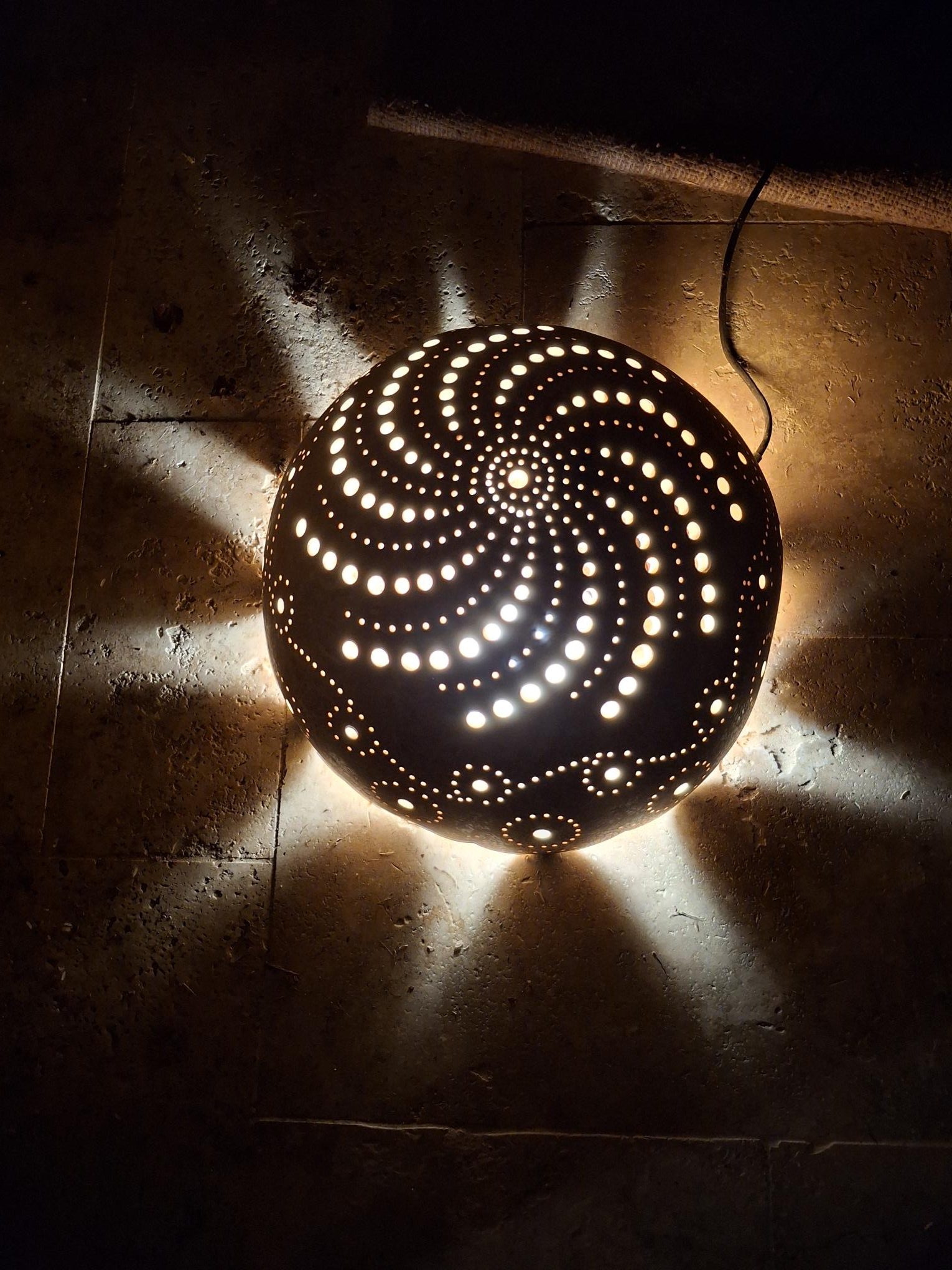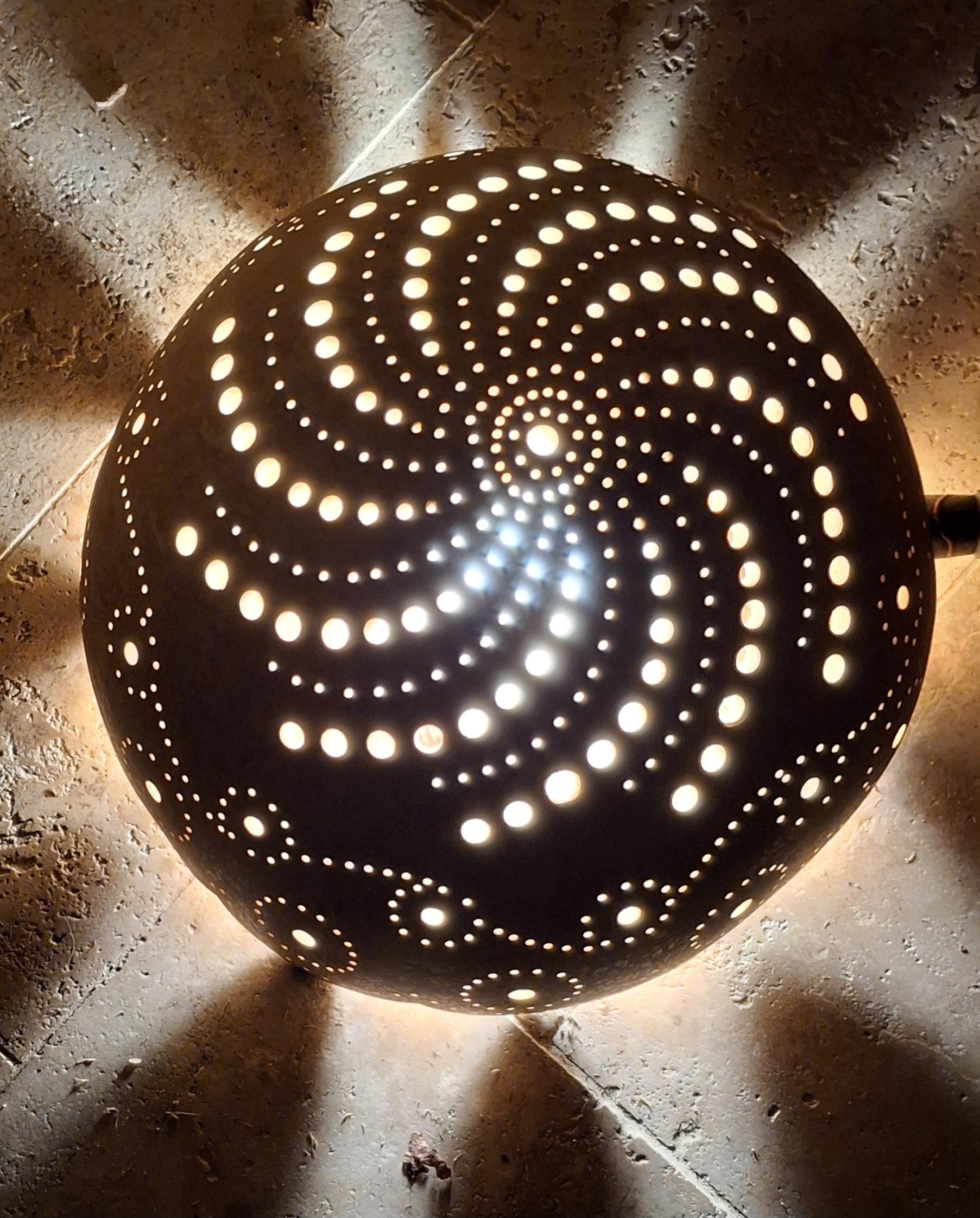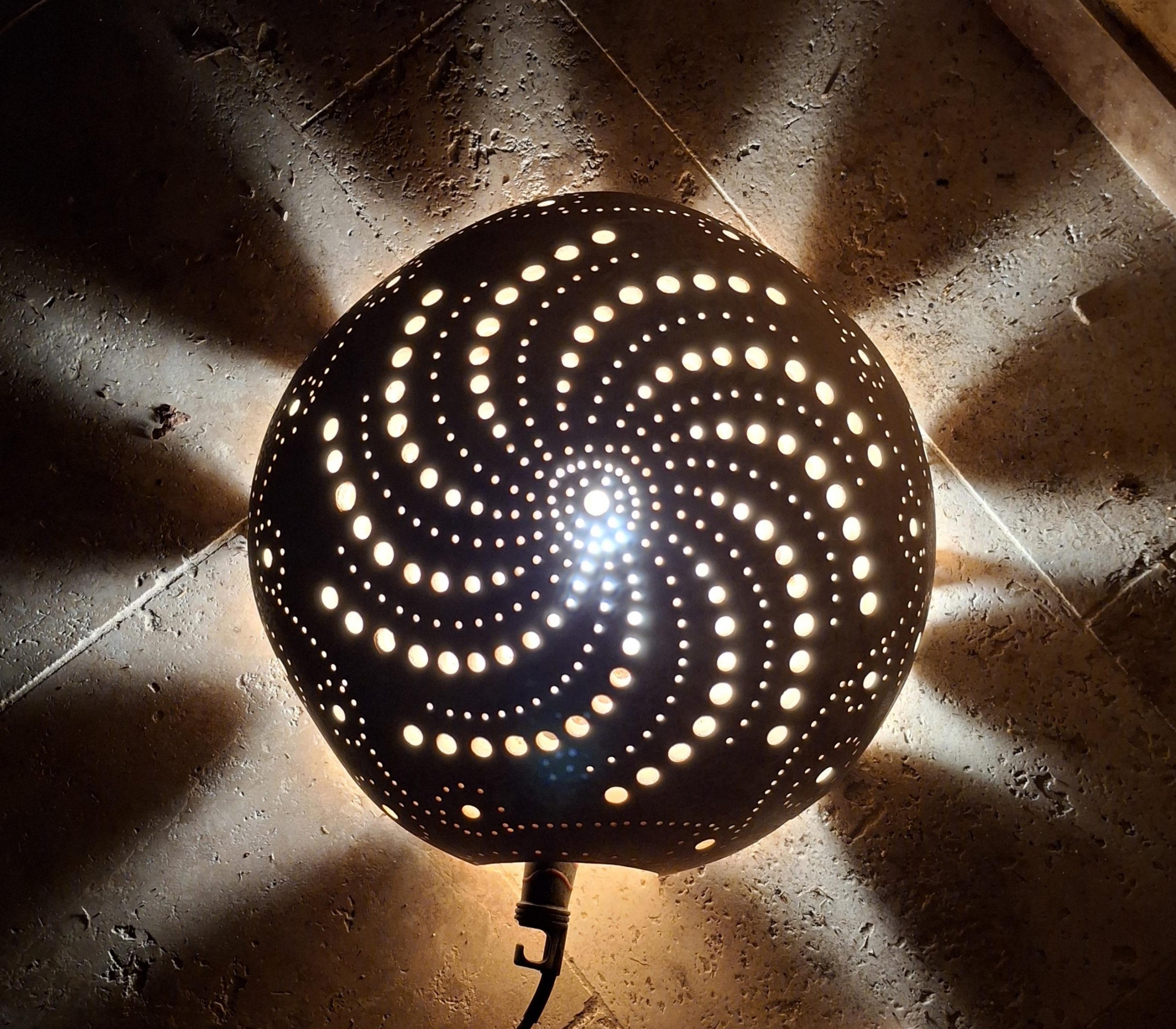 Lampe en calebasse taille medium, décorée motif spirale, Diamètre 44/46 cm